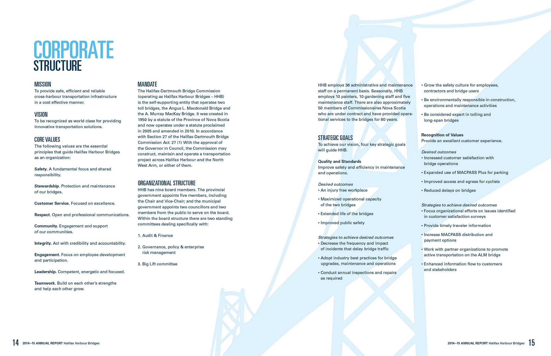 2014/2015 Annual Report for Halifax Harbour Bridges, done while working at Prime Creative. Print and digital versions (42 pages). Responsible for design and layout, typography, illustration, infographics, and photo manipulation.